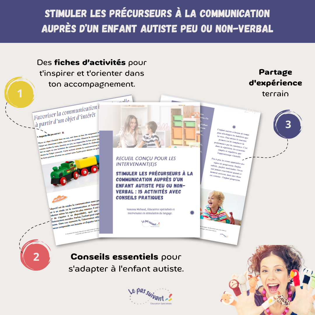 🎁Obtiens gratuitement le recueil d'activités « Stimuler les précurseurs à la communication auprès d'un enfant autiste peu ou non-verbal : 15 activités avec conseils pratiques » (valeur de 27$).